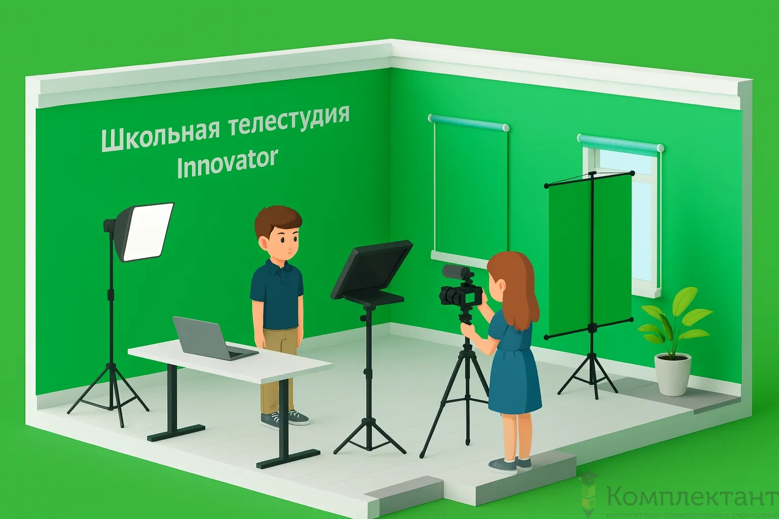 • Хромакей: переносной, зеленый, размеры 100×200 см и 300×300 см.
